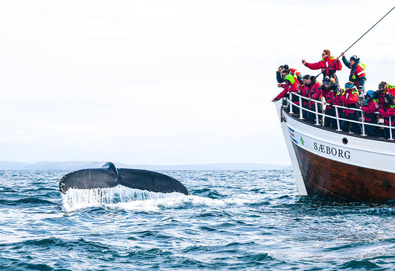 Derefter sejler vi videre ud i Skjálfandi-bugten på hvalsafari, hvor resten af turen bruges på at spotte de majestætiske havdyr. Hver sommer besøger mange hvaler bugten for at spise af de næringsrige farvande. At komme tæt på disse imponerende skabninger er en oplevelse, der næsten ikke kan beskrives med ord.